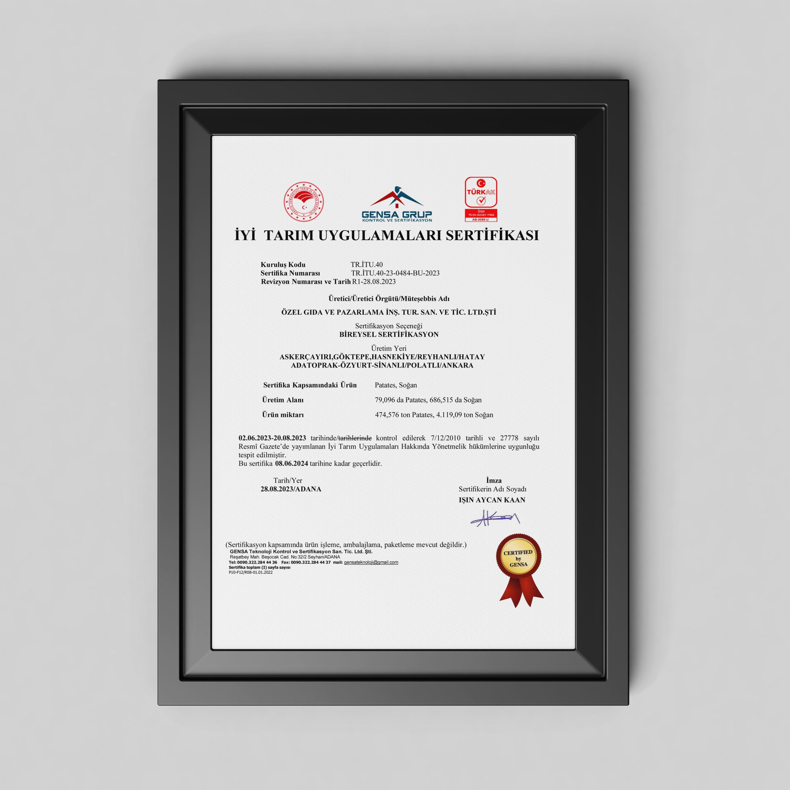 Şirket olarak büyük çaba ve kararlılıkla çalışmalarımız sonucunda Global Gap Sertifikası’na layık görüldük. Uluslararası standartta gıda güvenliği ve üretim koşulları sağlamış işletmelere verilen, Avrupa pazarında